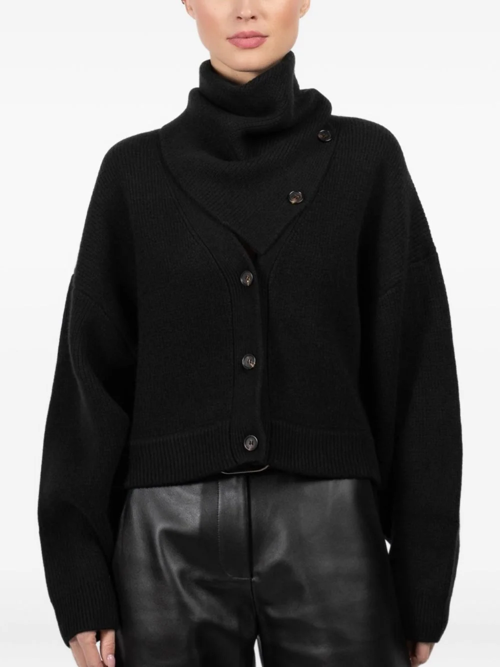 asymmetric-neck buttoned cardigan Highlights - Black - Asymmetric neck - Button fastening - High neck - Ribbed knit Imported Composition Cashmere 100% Washing instructions Read Manufacturer Guidelines