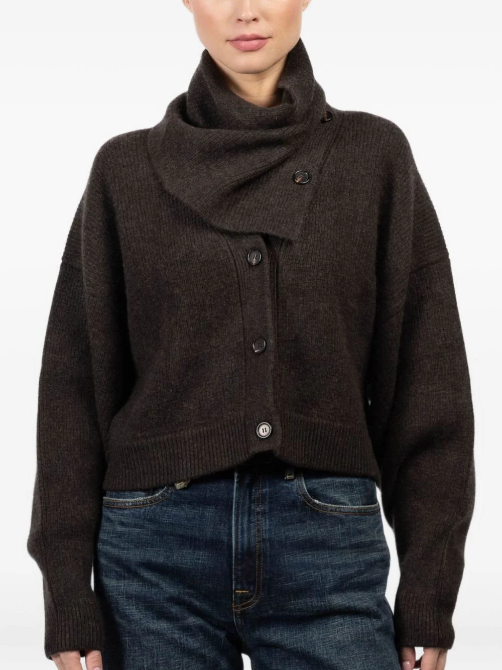 button-fastening funnel-neck cardigan Highlights - Brown - Funnel neck - Button fastening - Long sleeves - Ribbed trims Imported Composition Cashmere 100% Washing instructions Read Manufacturer Guidelines