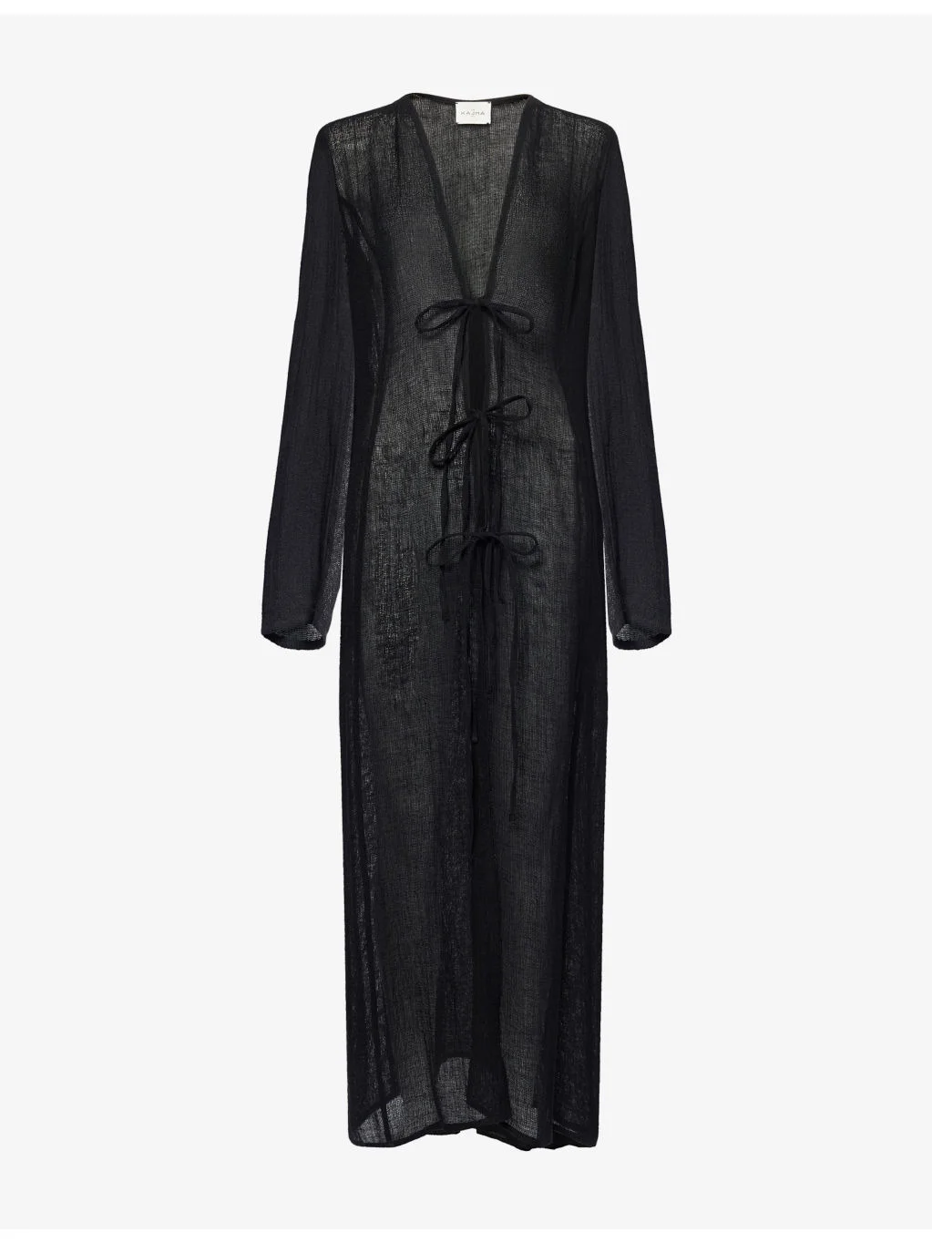 PRODUCT DETAILS - Le Kasha linen maxi dress - 100% linen - Self-tie fastening at front - Adjustable front ties, V-neck opening, long sleeves - Hand wash - Made in France - True to size - Model is 5ft 10in/1.78m and wears a size small - Lightweight, non-stretch Ref: R04464195
