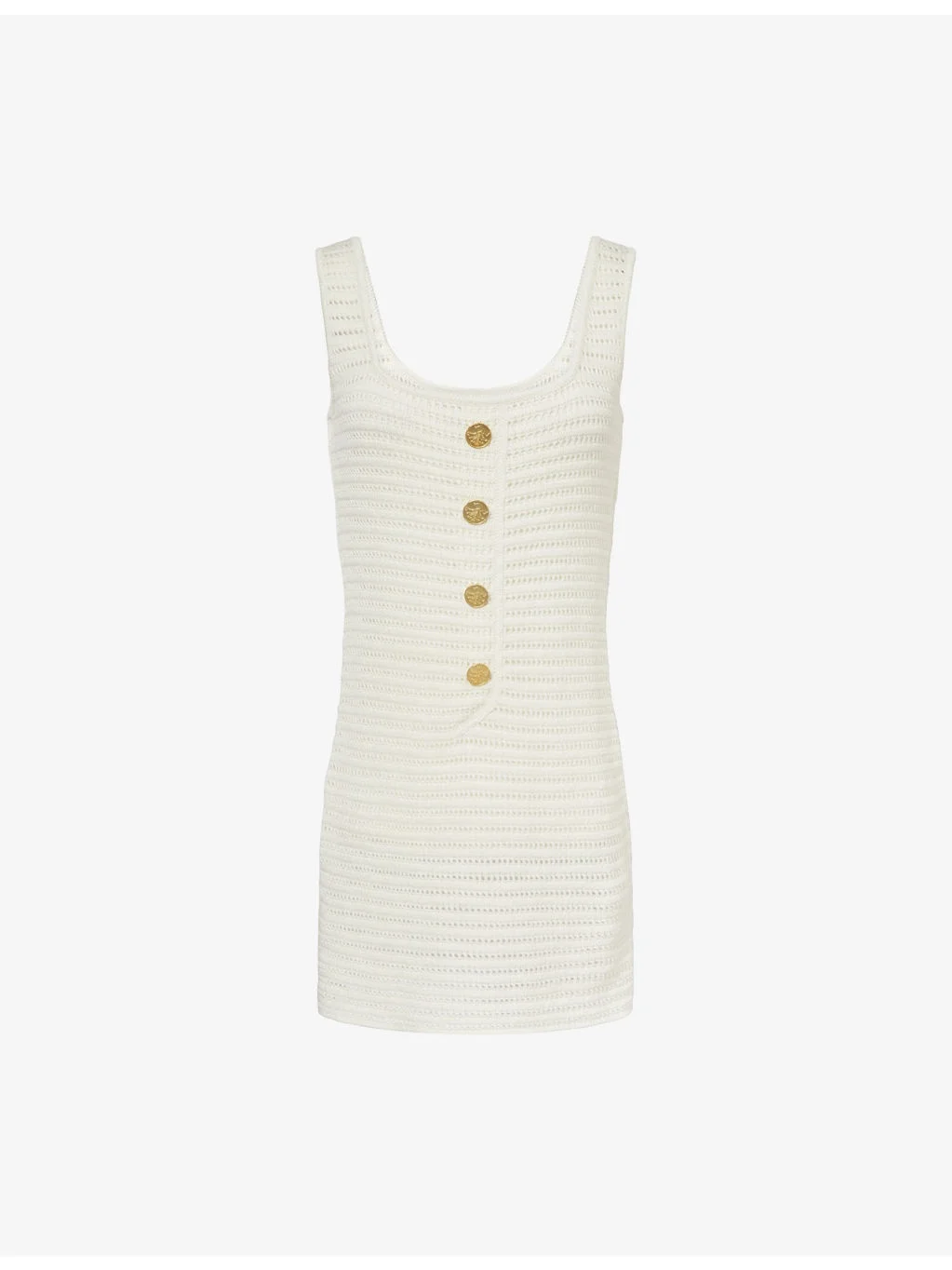 PRODUCT DETAILS - Le Kasha linen mini dress - 100% linen - Slim fit, square neck, shoulder straps, engraved buttons embellishment at front, all-over crochet texture - Machine wash at 30°C - Made in France - True to size - Size small: length 30in / 77cm - Model is 5ft 10in/1.78m and wears a size small - Midweight, stretchy Ref: R04464210