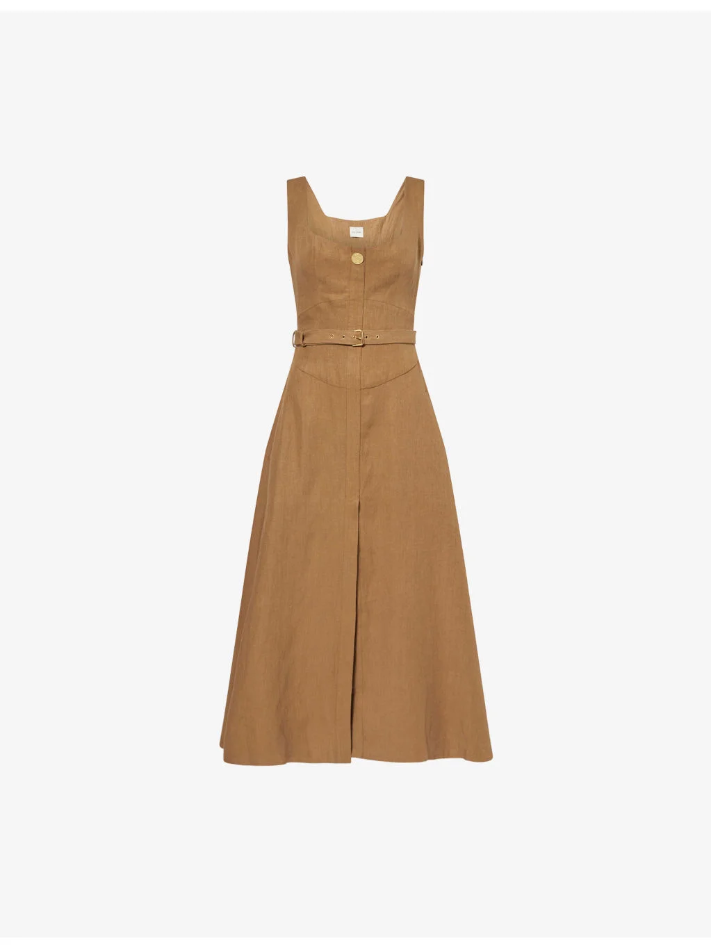 PRODUCT DETAILS - Le Kasha linen midi dress - 100% linen - Concealed zip fastening at side - Regular fit, scoop neck, shoulder straps, belt loops, detachable belt, engraved buttons embellishment and two welt pockets at front, slit at front, flared hem - Machine wash at 30°C - Made in France - True to size - Size small: length 51in / 130cm - Model is 5ft 10in/1.78m and wears a size small - Lightweight, stretchy Ref: R04464214
