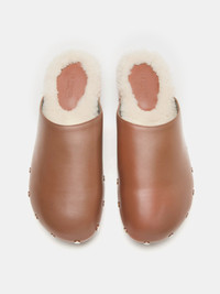 Agnes Sabot, handcrafted in nougat leather with a cream shearling insole, silver tone stud detailing and 25mm platform with anti-slip rubber grip. Slip on. Made in Italy.