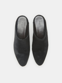 Allegra Mule, handcrafted in black calf hair, with a cushioned calf leather insole and a 35mm heel. Slip on. Made in Italy.
