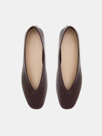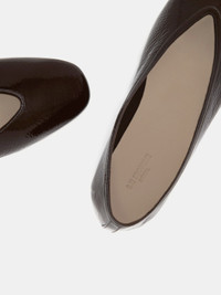 Luna Slipper in chocolate patent leather with a cushioned calf leather insole and leather piping. 8mm heel. Made in Italy.