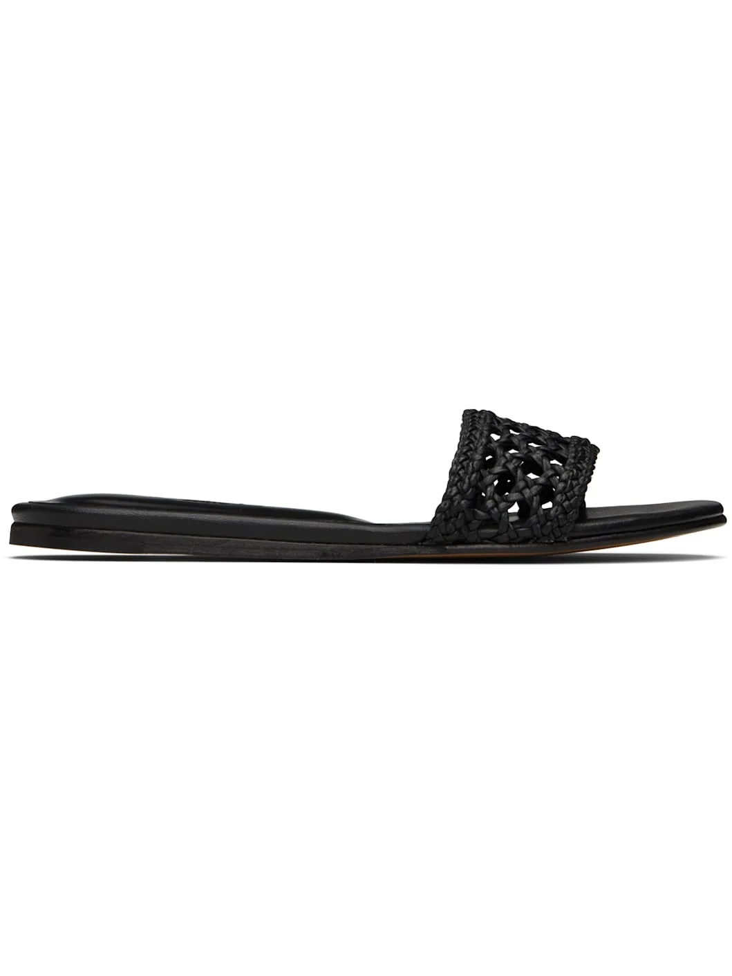 Handcrafted woven leather pool slides in black. · Open toe · Logo embossed at padded calfskin footbed · Leather sole with rubber injection Supplier color: Black Upper: leather. Sole: leather, rubber. Made in Italy 251226F124001