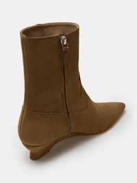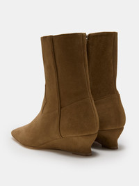Camille Boot, handcrafted in taupe suede, with a pointy toe, cushioned calf leather insole and zip fastening. 40mm wedge heel. Made in Italy.