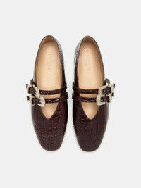 Claudia Slipper, handcrafted in coco brown croc embossed calf leather with adjustable straps, western buckles in a new sacchetto construction, with a soft cushioned calf leather insole and leather piping. 8mm heel. Made in Italy.