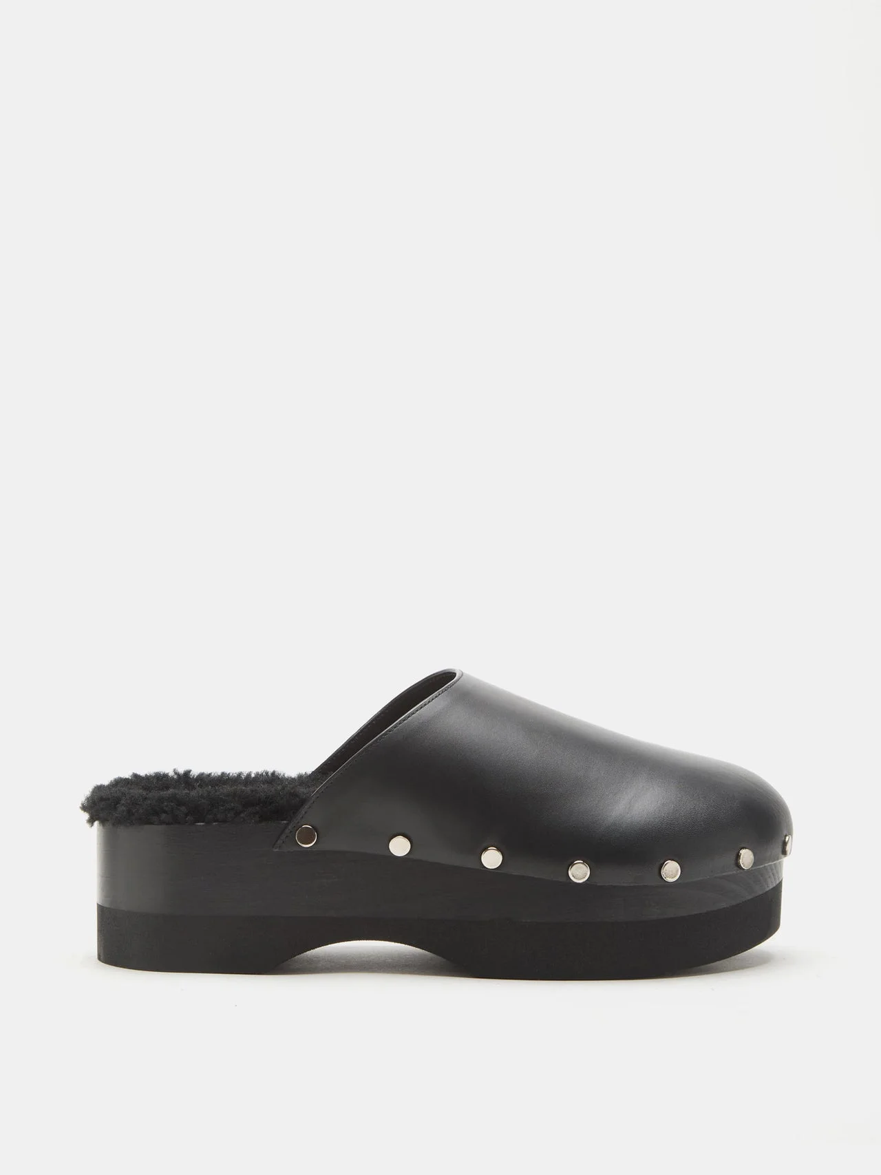 The Clog, handcrafted in black leather with a tonal black shearling insole, silver tone stud detailing and 50mm platform sole with anti-slip rubber grip. Slip on. Made in Italy.