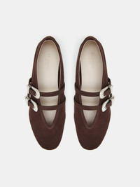 Ballet Claudia Slipper in chocolate suede with two adjustable straps, western buckles, a cushioned calf leather insole and leather piping. 8mm heel. Made in Italy.