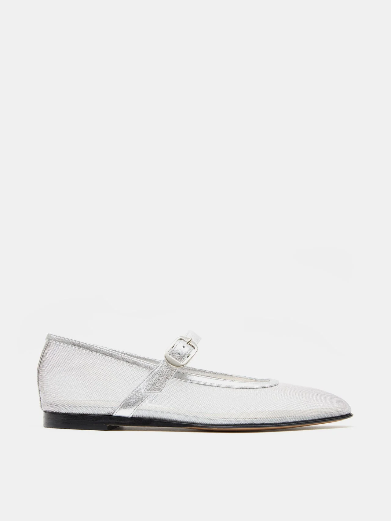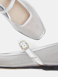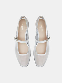 Ballet Mary Jane, handcrafted in silver mesh with buckle-fastening, a cushioned calf leather insole and patent leather piping. 10mm heel. Made in Italy. Ballet Mary Jane, handcrafted in silver mesh with buckle-fastening, a cushioned calf leather insole and patent leather piping. 10mm heel. Made in Italy.