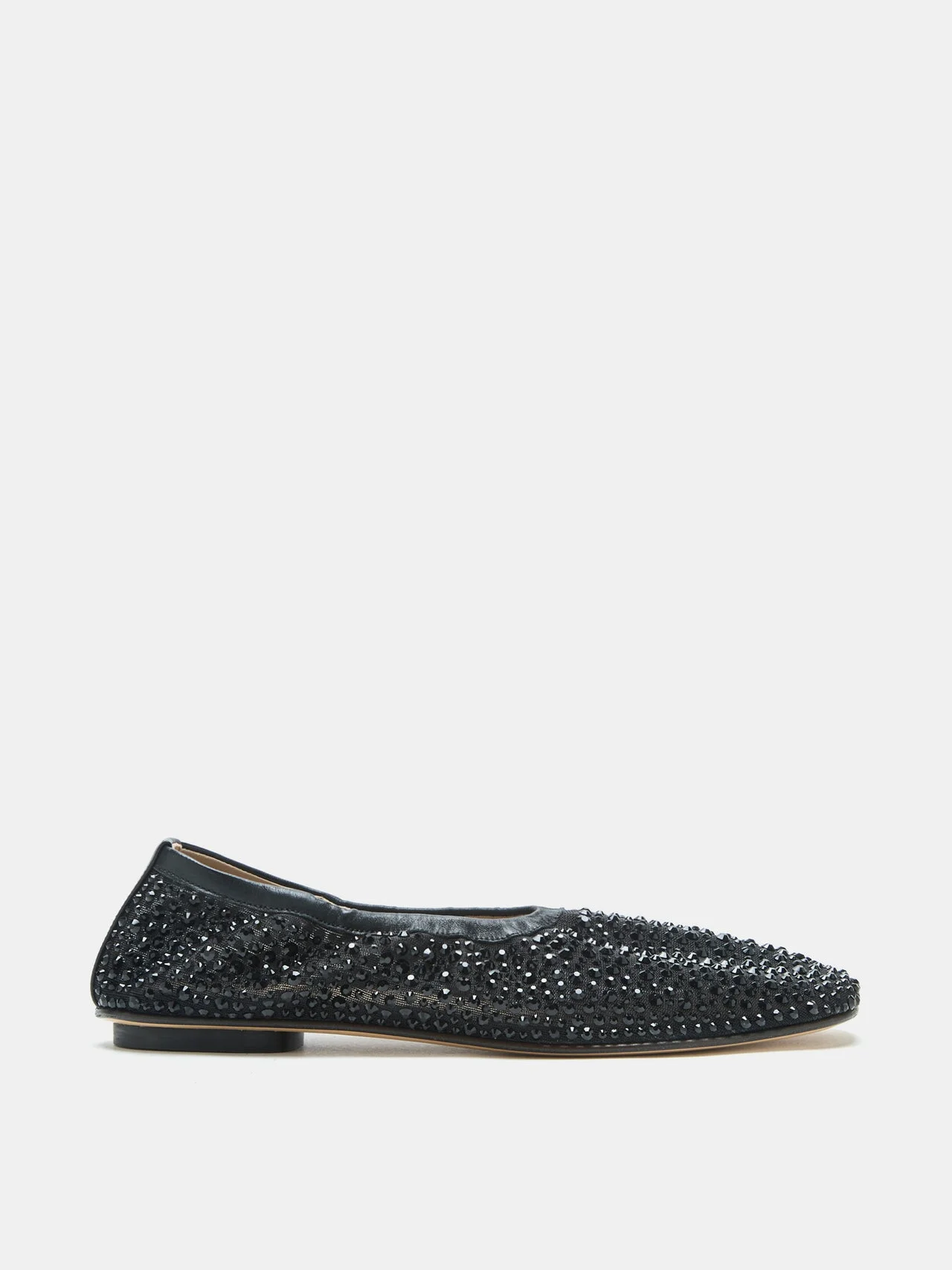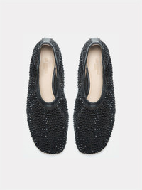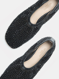 Mica Flat, handcrafted in black mesh with crystal detailing, soft elastic trim and a cushioned calf leather insole. 10mm heel. Made in Italy.