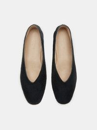 Regency Slipper, handcrafted in black calf hair, in a new sacchetto construction, with a soft cushioned calf leather insole and leather piping. 8mm heel. Made in Italy.