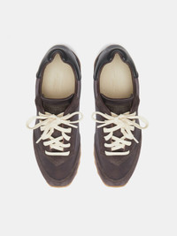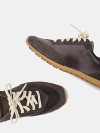 Slim Runner Sneaker, handcrafted in chocolate satin with suede and leather details. Cushioned insole and lining in goat skin, tread in smooth rubber. Lace-up fastening. Made in Italy. Slim Runner Sneaker, handcrafted in chocolate satin with suede and leather details. Cushioned insole and lining in goat skin, tread in smooth rubber. Lace-up fastening. Made in Italy.