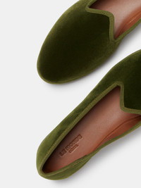 The Soft Venetian Slipper in olive green is hand finished with stitching and rubber soles for a comfortable step. Made in Italy.