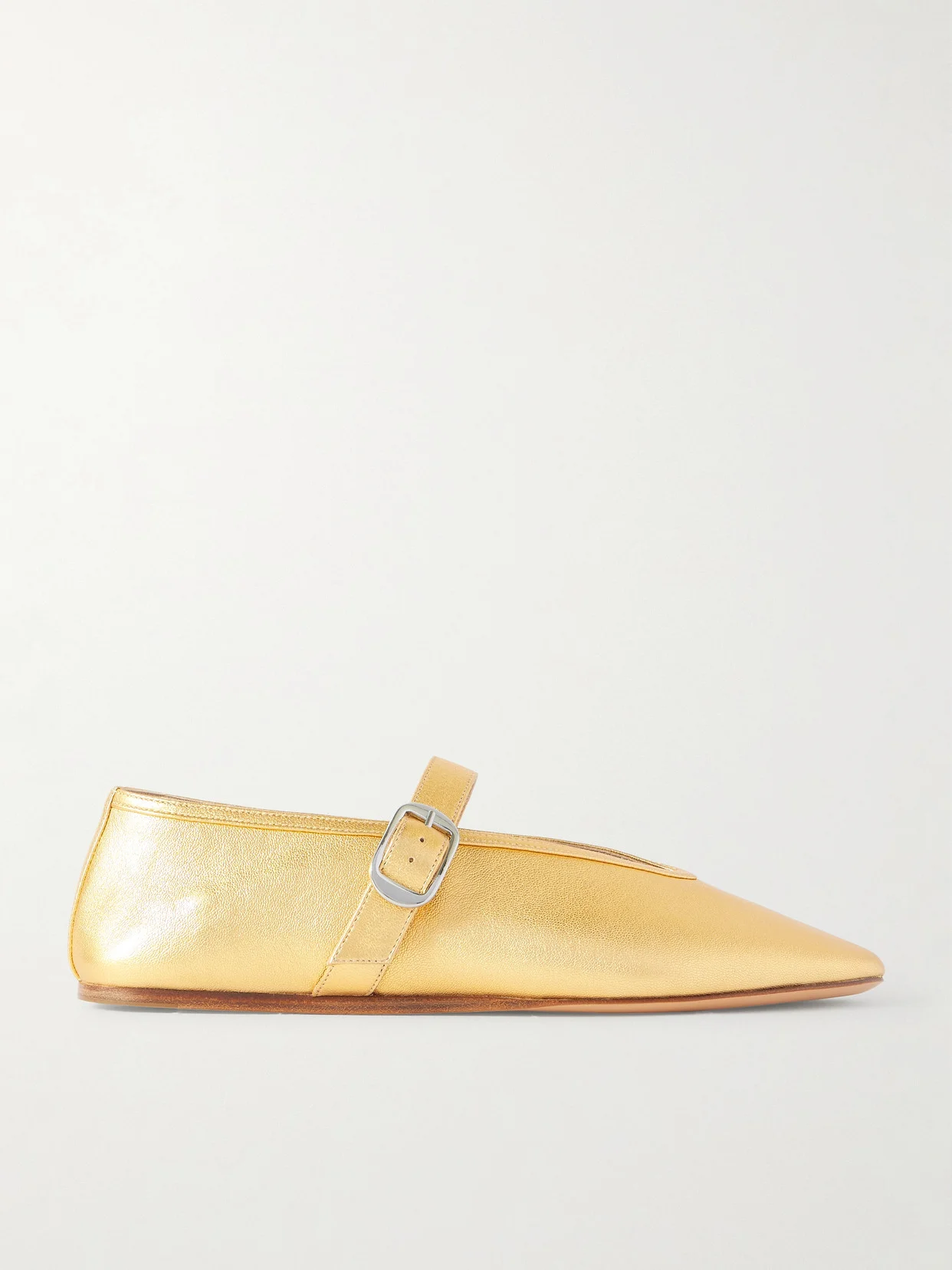 For design inspiration, Le Monde Beryl's co-founders like to "imagine the possible scenarios and settings that our shoes might travel to, and be worn in". Crafted in Italy from metallic leather, these 'Stella' ballet flats have a sweet Mary-Jane shape. Match your jewelry to the gold shade.