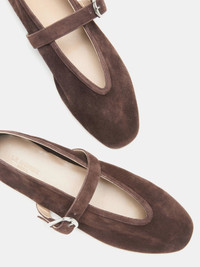Stella Slipper, handcrafted in chocolate brown suede with buckle-fastening, a cushioned calf leather insole and suede piping. 8mm heel. Made in Italy.