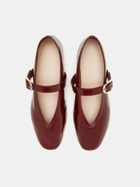 Stella Slipper, handcrafted in oxblood red patent leather, with buckle-fastening, a cushioned calf leather insole and leather piping. 8mm heel. Made in Italy.