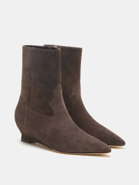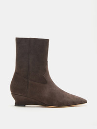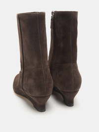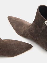Camille Boot, handcrafted in pepper suede, with a pointy toe and cushioned calf leather insole. Zip Fastening. 40mm heel. Made in Italy.