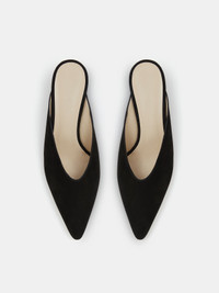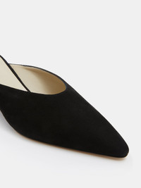 Victoria Micro Wedge Mule, handcrafted in black suede with a pointy toe, cushioned calf leather insole and 40mm heel. Slip on. Made in Italy.