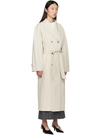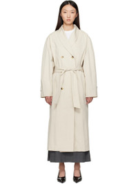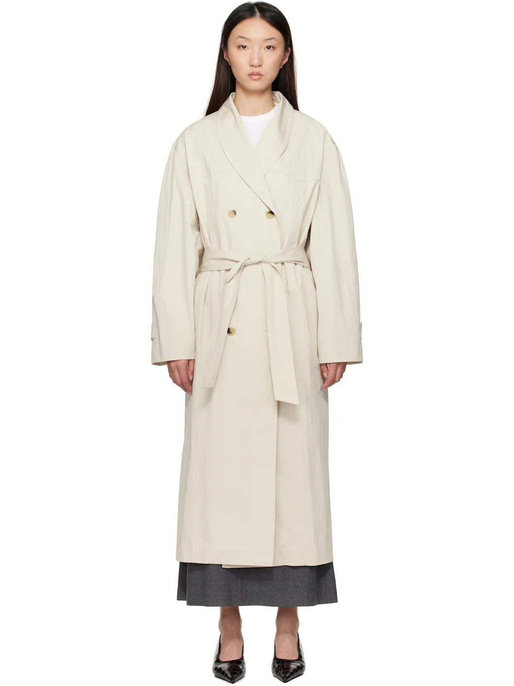 Crinkled cotton- and nylon-blend twill trench coat. · Shawl collar · Double-breasted button closure · Seam pockets · Belt loops and detachable self-tie belt · Button tab at cuffs · Inverted box pleat with button tab at back hem · Welt pocket at interior · Full plain-woven cotton lining Supplier color: Ivory Body: 66% cotton, 34% nylon. Lining: 100% cotton. Made in South Korea 252495F067002