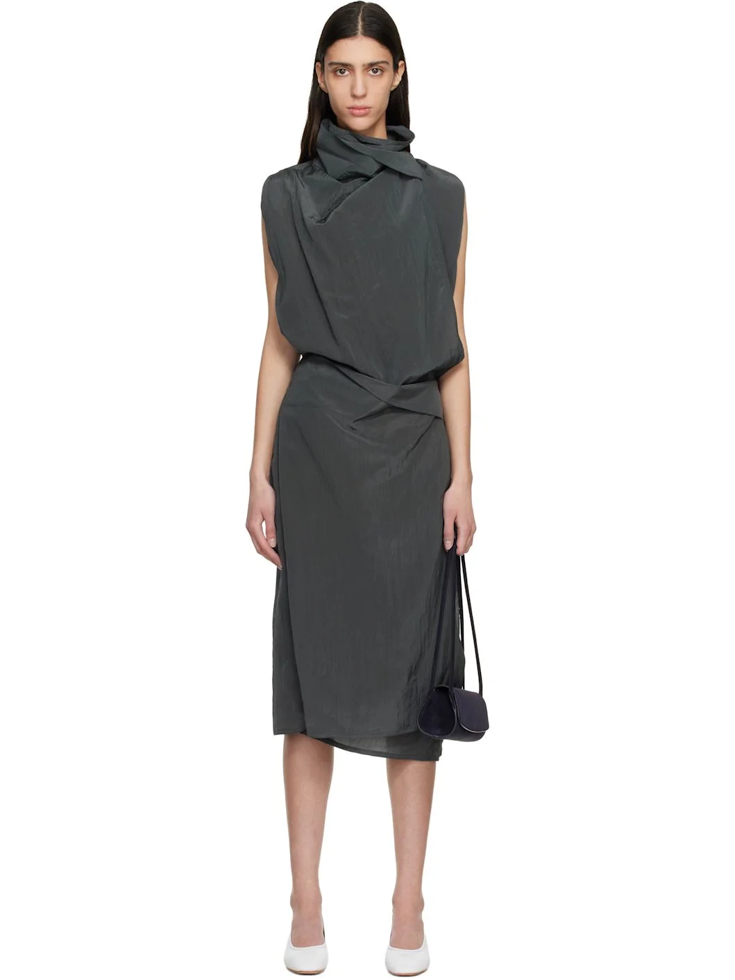 Crinkled nylon-blend taffeta midi dress. · Wrap construction · Cowl neck · Self-tie fastening at waist Supplier color: Grey 80% viscose, 20% nylon. Made in South Korea 261495F054001