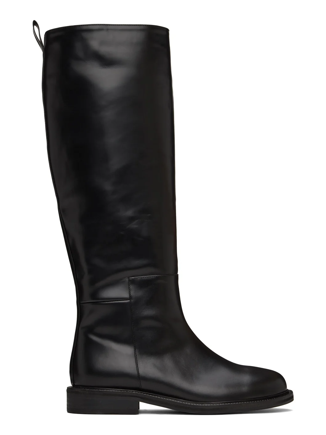 Knee-high paneled buffed leather boots in black. · Pull-loop at heel collar · Scalloped detailing at welt · Rubber injection at stacked leather heel · Leather outsole Supplier color: Black