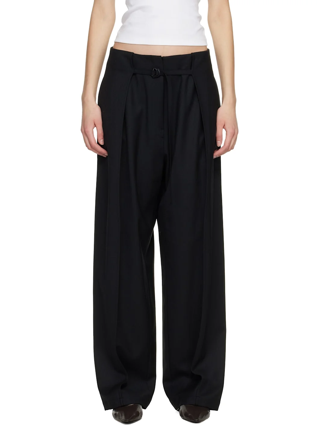 Stretch wool-blend twill trousers. · Loose-fit · Cinch strap at front · Four-pocket styling · Zip fly · Pleats and pinched seams at front · Full satin lining Supplier color: Black Body: 50% wool, 48% polyester, 2% polyurethane. Lining: 100% polyester. Made in South Korea 261495F087000