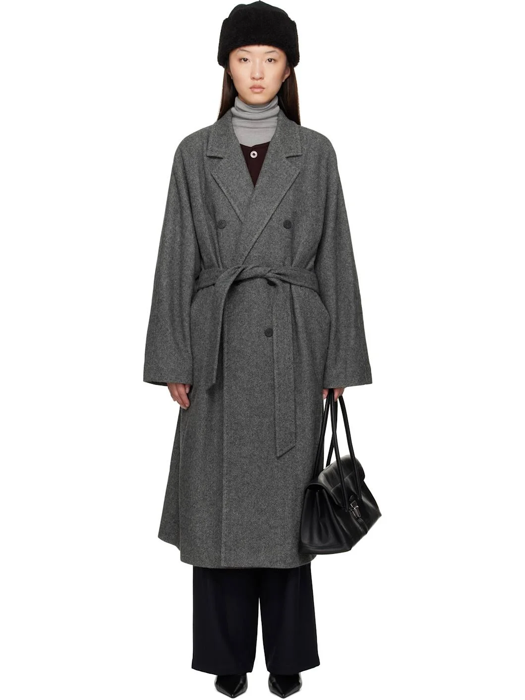 Wool- and alpaca-blend twill coat. · Notched lapel · Double-breasted button closure · Belt loops and detachable self-tie belt · Welt pockets · Saddle shoulders · Welt pocket at interior · Full satin lining Supplier color: Gray Body: 70% wool, 30% alpaca. Lining 1: 100% polyester. Lining 2: 65% polyester, 35% cotton. Made in South Korea 252495F059000