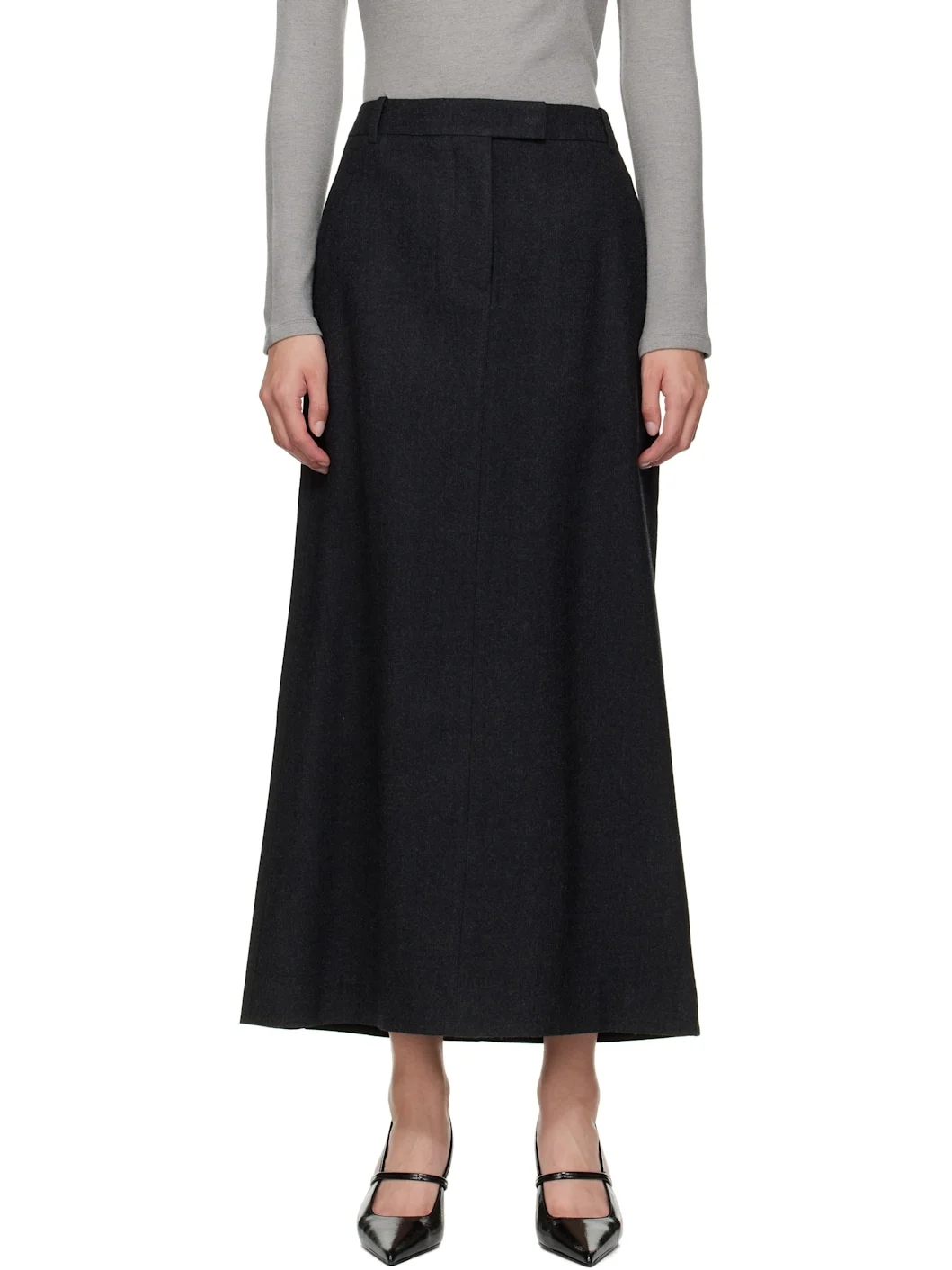 Wool melton maxi skirt. · Belt loops · Two-pocket styling · Zip fly · Full satin lining · Twill pocket lining Supplier color: Charcoal Body: 100% wool. Lining 1: 100% polyester. Lining 2: 65% polyester, 35% cotton. Made in South Korea 252495F090000
