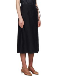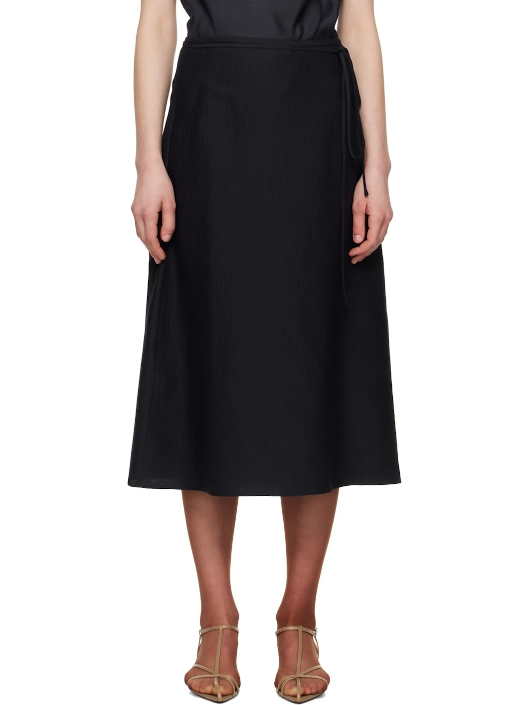 Wool- and silk-blend seersucker midi skirt. · Detachable self-tie belt · Concealed zip closure at side · Darts at back waistband Supplier color: Navy 53% wool, 47% silk. Made in South Korea 251495F092001