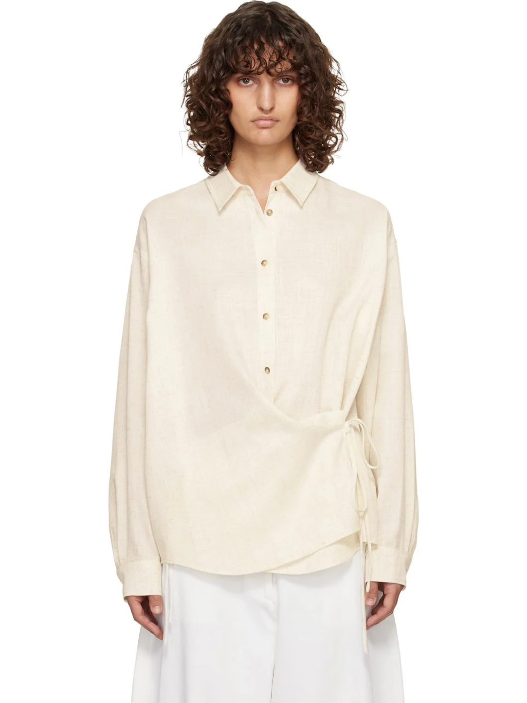 Hopsack shirt. · Spread collar · Button closure · Self-tie fastenings at shirttail hem and interior · Dropped shoulders · Buttoned cuffs · Twin pleats at back yoke Supplier color: Ivory 100% polyester. Made in South Korea 261495F109002