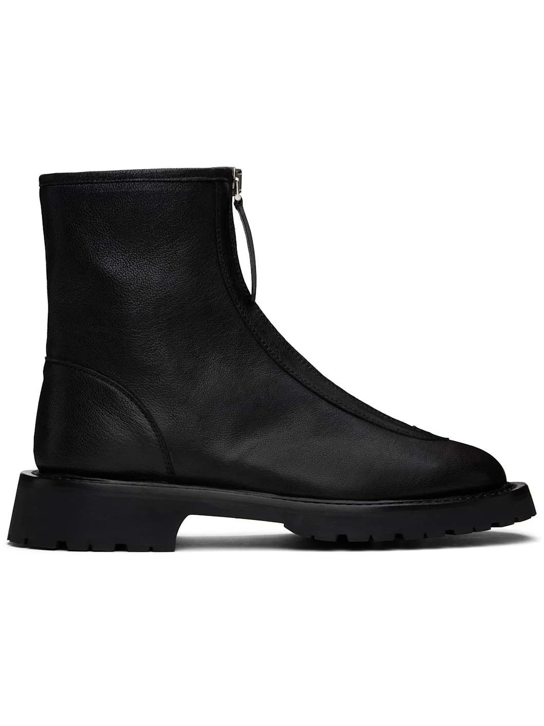Ankle-high grained leather boots in black. · Almond toe · Zip closure at vamp · Grained leather lining · Topstitching at welt · Treaded foam rubber sole Supplier color: Black Upper: leather. Sole: rubber. Made in Italy 242448F113005