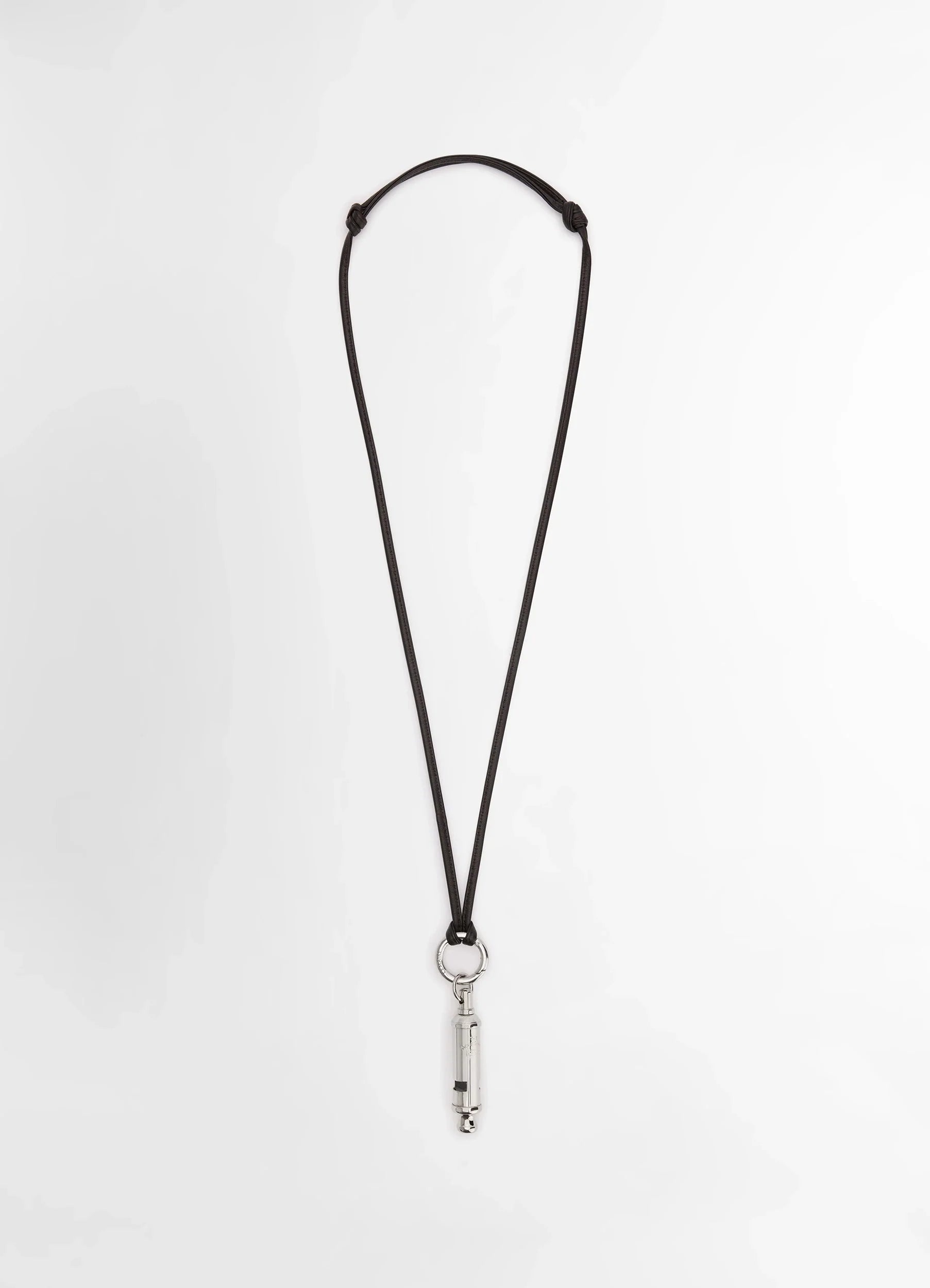 Thought as a continuation of musical-themed necklaces, LEMAIRE introduces the ACME Whistle Necklace to its cabinet of curiosities. A collaboration with the British manufacturer founded in 1870, this piece comprises of a brass necklace with a silver finish and an original and functioning whistle. This extraordinary pendant is attached to a silver hook linked to an adjustable leather strap. DETAILS - Silver finish - Original ACME whistle - Leather strap Made in the United Kingdom Style: AC1202 LO036 FABRICS & CARE Main Material: 100% Brass Second Material: 100% Lamb