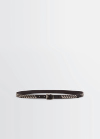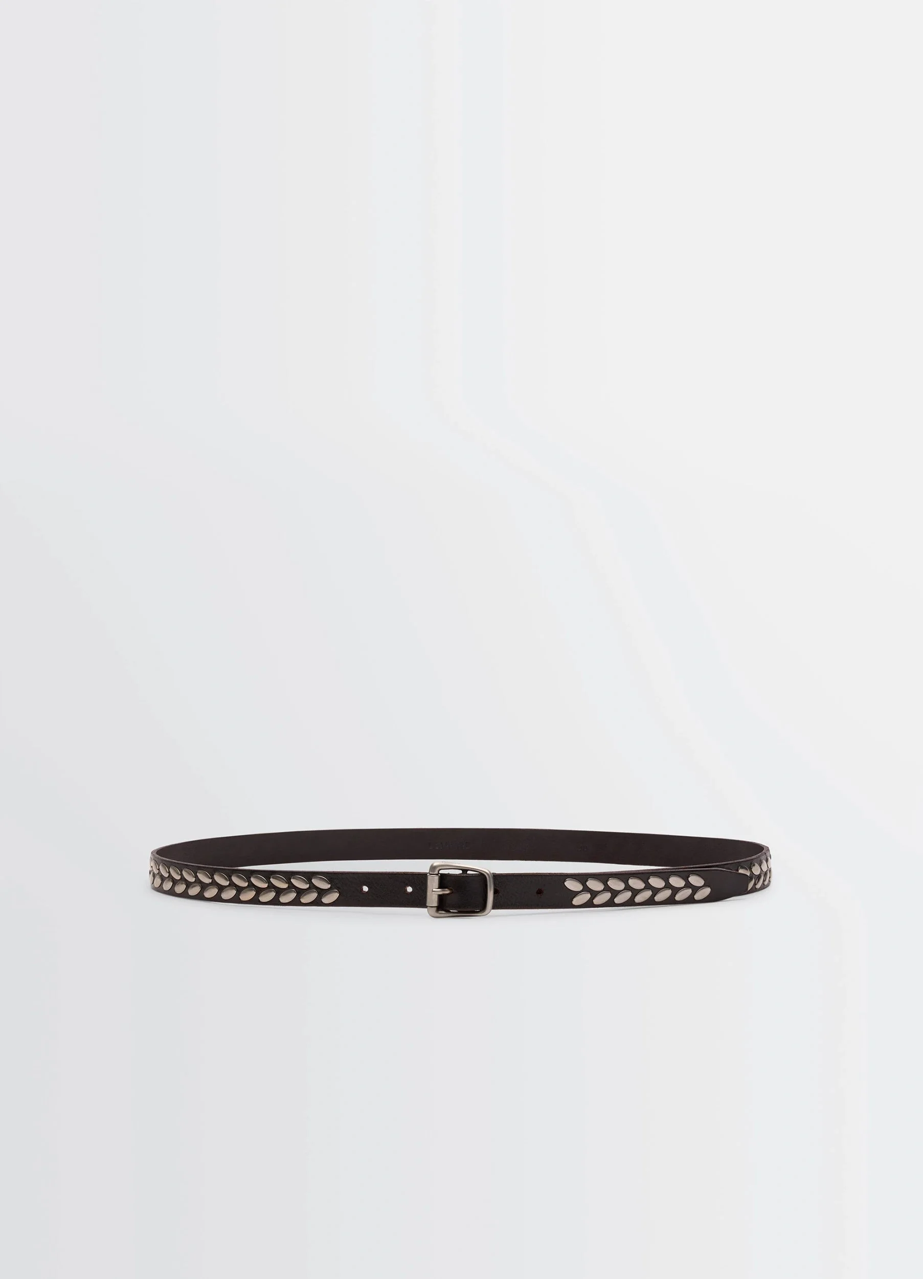 This new unisex belt is introduced this season to complement the LEMAIRE vestiaire. The Almond Stud Belt 20 is crafted in smooth vegetable-tanned leather with a soft hand, and is adorned with almond-shaped brushed silver metal studs laid in a wheat ear pattern. It ties via a matte silver buckle which completes adding a rustic charm to the silhouette. DETAILS - Unisex - 20mm / 0,78in wide - Wheat ear matte silver stud pattern - Brushed silver wheat ear pattern - Logo engraved Made in Italy Style: AC1212 LL0055 FABRICS & CARE Main Material: 100% Cow Second matierial: 100% Zamak Trims: 100% Steel Do not wash Do not bleach Do not tumble dry Do not iron Professional leather clean only