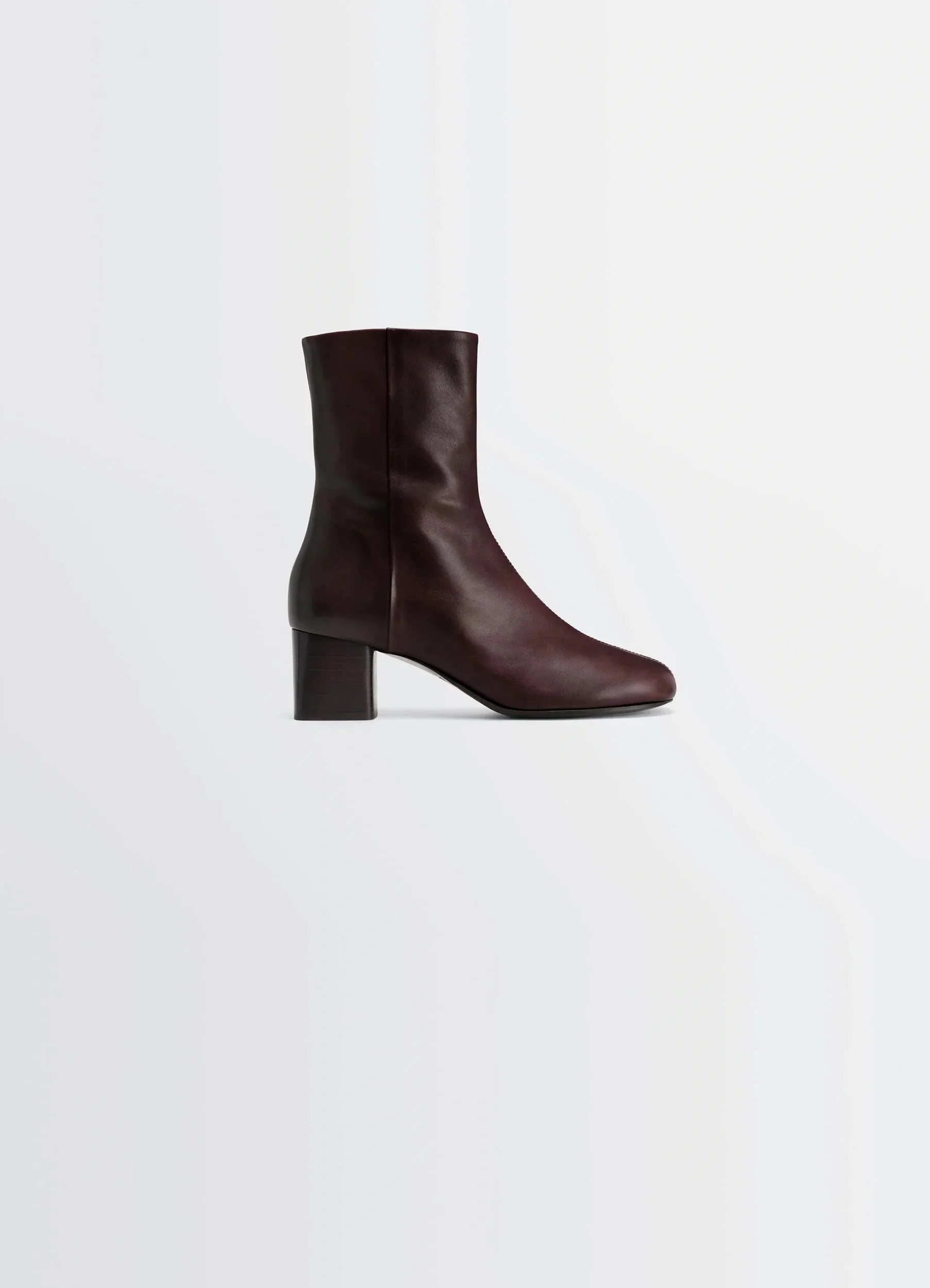 The Anatomic line is emblematic of the Lemaire wardrobe, characterized by its rounded toe and nappa leather insoles. Lightweight and ergonomic, they emphasize ease of movement. This pair of heeled booties is crafted in LWG Gold-certified, glossy vegetable-tanned leather. DETAILS Heeled Anatomic ankle boots in glossy vegetable-tanned leather Round toe Side zipper closure with leather pull tab Leather block heel Leather outsole, insole, and lining Heel height: 5.5 cm Made in Portugal Style: FO0206 LL0078 CARE Main material: 100% sheep Main lining: 100% cow If exposed to water or high humidity, dry your shoes well with an absorbent cloth and let them air dry before storing them. Smooth leather: Use a soft cloth and apply a measured amount of uncolour milk or cream. Suede leather: Brush lightly with a sponge or special suede cloth.