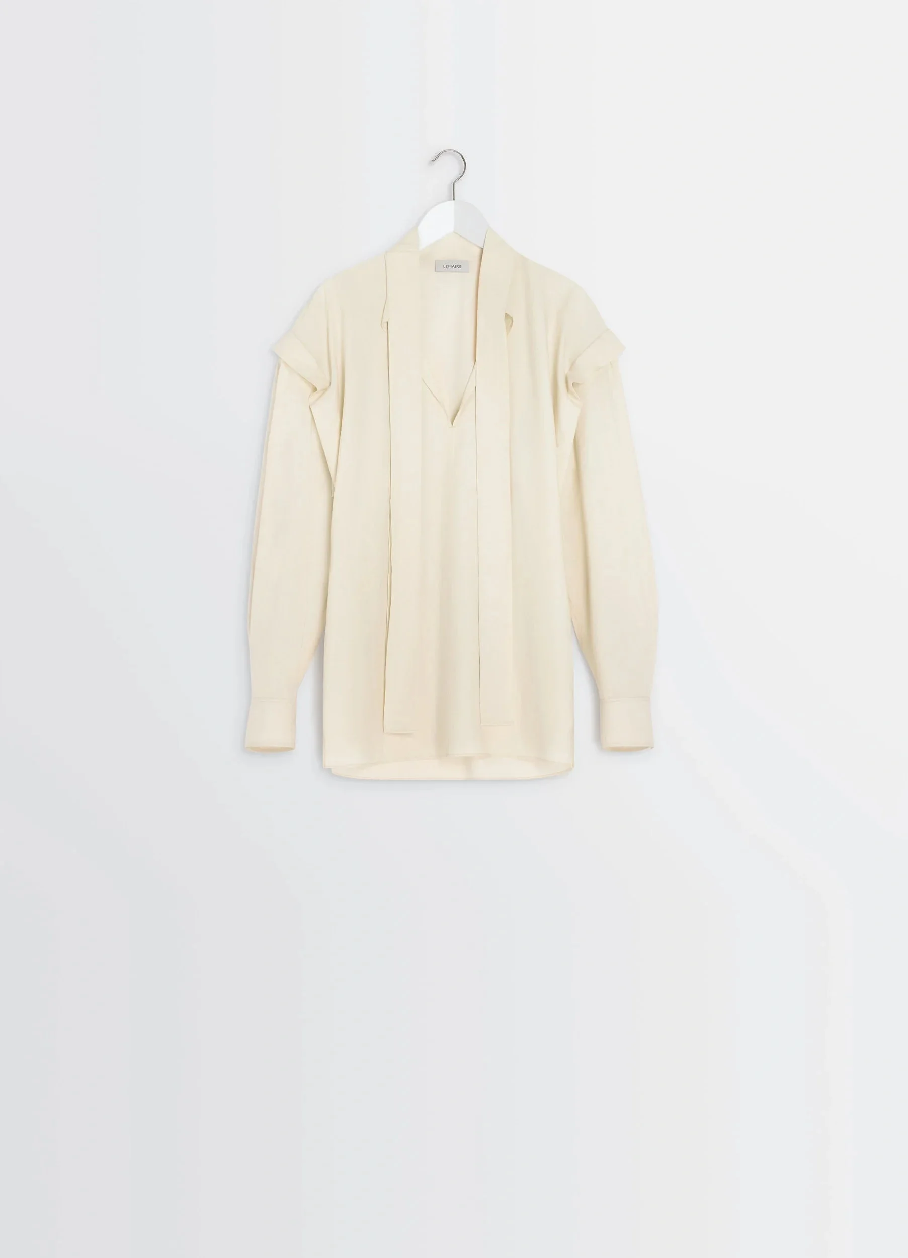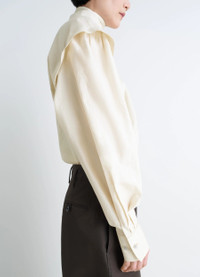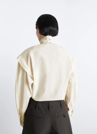 This ascot blouse is inspired by Lemaire's love for movement. It is made from a washed cotton-silk blend with a light patina and soft hand. DETAILS Ascot blouse in washed cotton silk blend Straight cut Ascot collar with side slit Shoulder pleats Trompe-l’oeil-style sleeves Straight buttoned cuffs Front slit Made in Portugal Style : TO1470 LF1500 The model is 177 cm tall and is wearing a size 36 (S). FABRICS & CARE Main Material: 80% Cotton 20% Silk