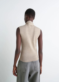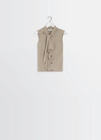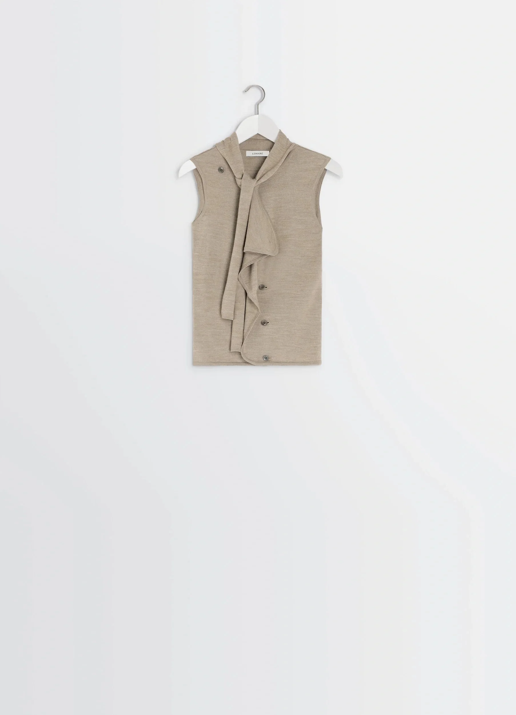 This asymmetrical sleeveless cardigan is part of an evolving, modular wardrobe that reflects Lemaire's love for movement. Featuring panels to tie or button, it is knitted in a blended merino wool that is both dry and soft. The model is 177 cm and is wearing a size 36 (S). This asymmetrical sleeveless cardigan is part of an evolving, modular wardrobe that reflects Lemaire's love for movement. Featuring panels to tie or button, it is knitted in a blended merino wool that is both dry and soft. The model is 177 cm and is wearing a size 36 (S). DETAILS Asymmetrical sleeveless cardigan in merino wool blend Fitted cut Crewneck Integrated scarf Asymmetrical front closure for buttoning and draping Lacquered buttons Rib-knit trim Made in Portugal Style : TO1485 LK087 Asymmetrical sleeveless cardigan in merino wool blend Fitted cut Crewneck Integrated scarf Asymmetrical front closure for buttoning and draping Lacquered buttons Rib-knit trim Made in Portugal Style : TO1485 LK087 CARE Main Material: 50% Acrylic 50% Wool Hand wash Do not bleach Do not tumble dry Cool ironing Soft dry clean Dry flat Main Material: 50% Acrylic 50% Wool Hand wash Do not bleach Do not tumble dry Cool ironing Soft dry clean Dry flat