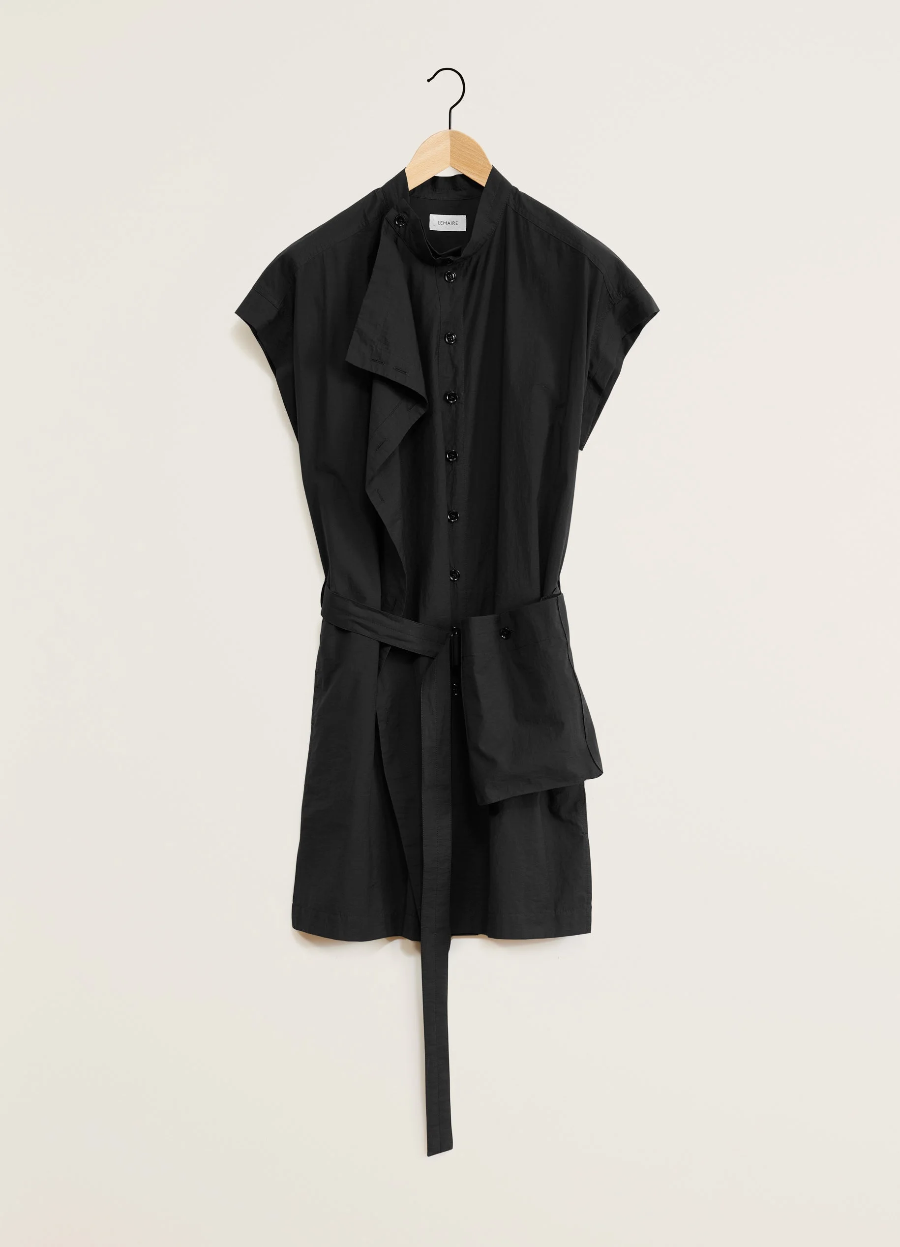 This dress is a new addition to LEMAIRE’s wardrobe. It is made from a blend of cotton and nylon that has undergone a thorough wash, hence the slightly nibbled seams. The Asymmetrical Sleeveless Dress features a flap that can be draped in different ways thanks to a central front placket and a button on the right side of the collar. A removable belt with a metal buckle allows its wearer to fasten the dress for a tighter fit. It also bears a detachable 3D pocket which can hold small daily essentials. DETAILS Straight fit - Flap on the center front that can be draped in different ways - Amovible belt and 3D pocket - Sleeveless - Above-the-knee length - Corozo buttons Made in Hungary Style: DR1063 LF1234 FABRICS & CARE Main Material: 84% Cotton 16% Polyamide Do not wash Do not bleach Do not tumble dry Cool ironing Soft dry clean