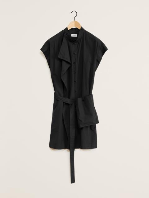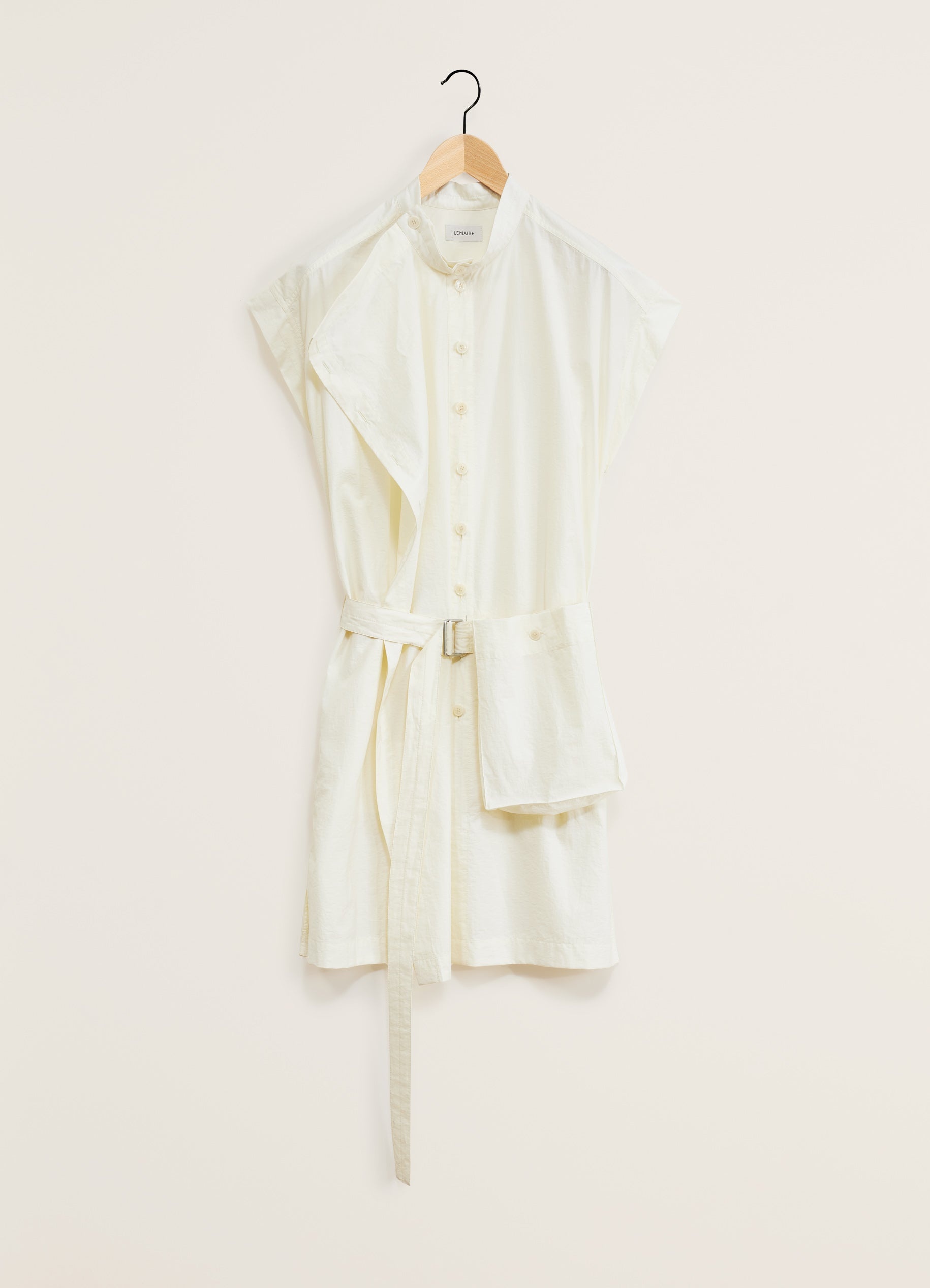 This dress is a new addition to LEMAIRE’s wardrobe. It is made from a blend of cotton and nylon that has undergone a thorough wash, hence the slightly nibbled seams. The Asymmetrical Sleeveless Dress features a flap that can be draped in different ways thanks to a central front placket and a button on the right side of the collar. A removable belt with a metal buckle allows its wearer to fasten the dress for a tighter fit. It also bears a detachable 3D pocket which can hold small daily essentials. DETAILS Straight fit - Flap on the center front that can be draped in different ways - Amovible belt and 3D pocket - Sleeveless - Above-the-knee length - Corozo buttons Made in Hungary Style: DR1063 LF1234 FABRICS & CARE Main Material: 84% Cotton 16% Polyamide Do not wash Do not bleach Do not tumble dry Cool ironing Soft dry clean