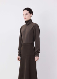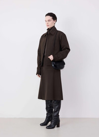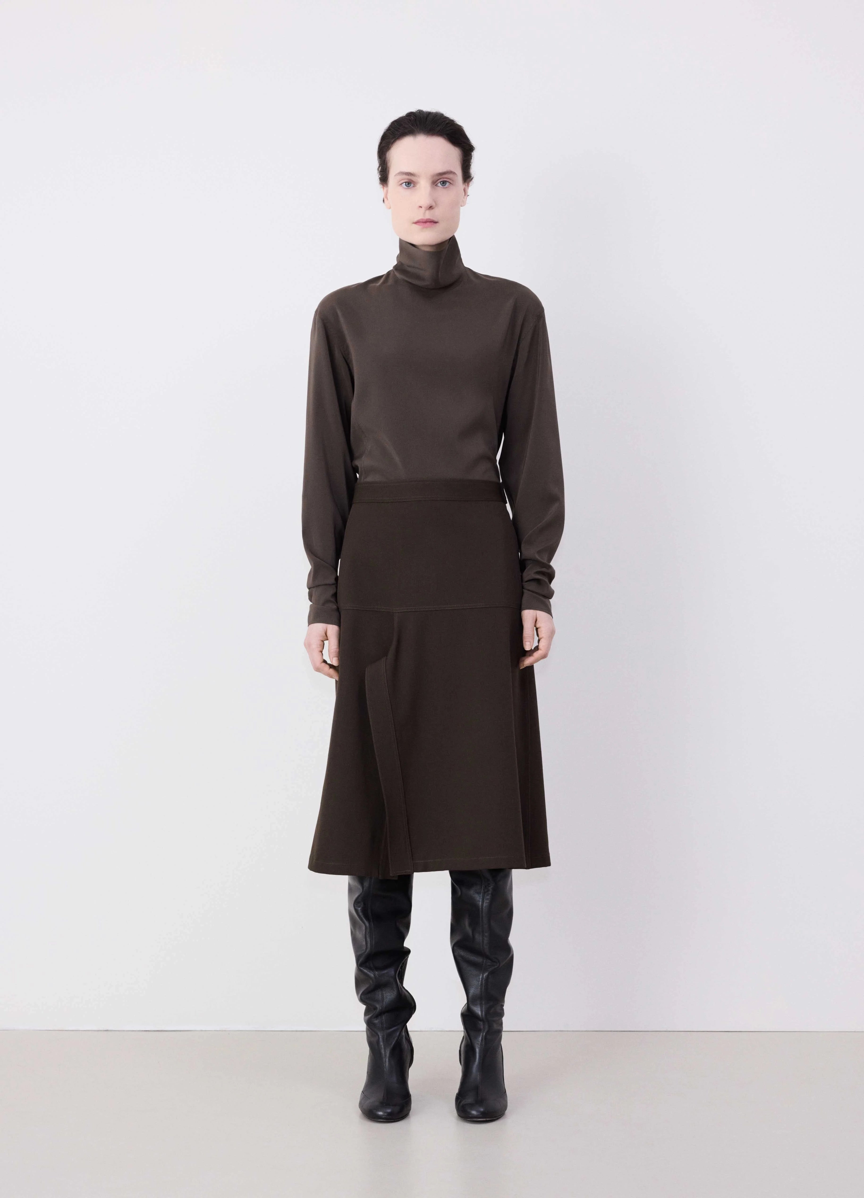 This is a new addition the LEMAIRE wardrobe. The Asymmetrical Wrapover Skirt is crafted in fluid gabardine with a washed finishing made from RWS wool. It features a belted waist closed via a single corozo button at the side of the hip, in addition to a metal zip. This fully lined knee-length style features a curvy slit on the right thigh. There is a contrast stitching running throughout the garment. DETAILS - Straight fit - Slitted - Zip fly - Fully lined Made in Romania Style: SK1043 LF1317 FABRICS & CARE Main Fabric: 100% Virgin Wool Main Lining: 100% Cotton Do not wash Do not bleach Do not tumble dry Cool ironing Soft dry clean