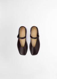 These shoes are classic accessories from LEMAIRE’s footwear family. Inspired by soft ballet slippers, the Ballerina are composed of two pieces of smooth lamb nappa leather that are stitched together, covering the upper and the heel. They fasten over the foot thanks to an adjustable strap with a metal buckle while a shiny finish elevates the Ballerina shoes towards delicate elegance. DETAILS - Leather lining - Strap with metal buckle - Leather sole - 2 cm / 0,8-inch heel Made in Portugal Style: FO0015 LL0023 FABRICS & CARE Main Material: 100% Lamb Main lining: 100% Calf Do not wash Do not bleach Do not tumble dry Do not iron Professional leather clean only If exposed to water or high humidity, dry your shoes well with an absorbent cloth and let them air dry before storing them. Smooth leather: Use a soft cloth and apply a measured amount of uncolour milk or cream. Suede leather: Brush lightly with a sponge or special suede cloth.