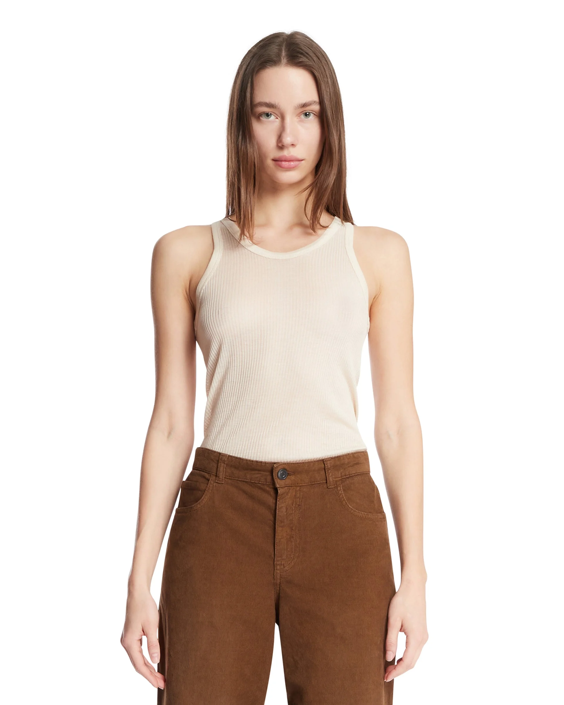 Lemaire Beige Viscose and Silk Top. Beige viscose and silk blend, sleeveless, straight hem. Ribbed texture, round neckline, regular fit. Vera is 176 cm and she is wearing size S. DETAILS Model: TS0026LK1017WH024 Composition: 83% Viscose, 12% Silk Made in: FRANCE Season: SS26