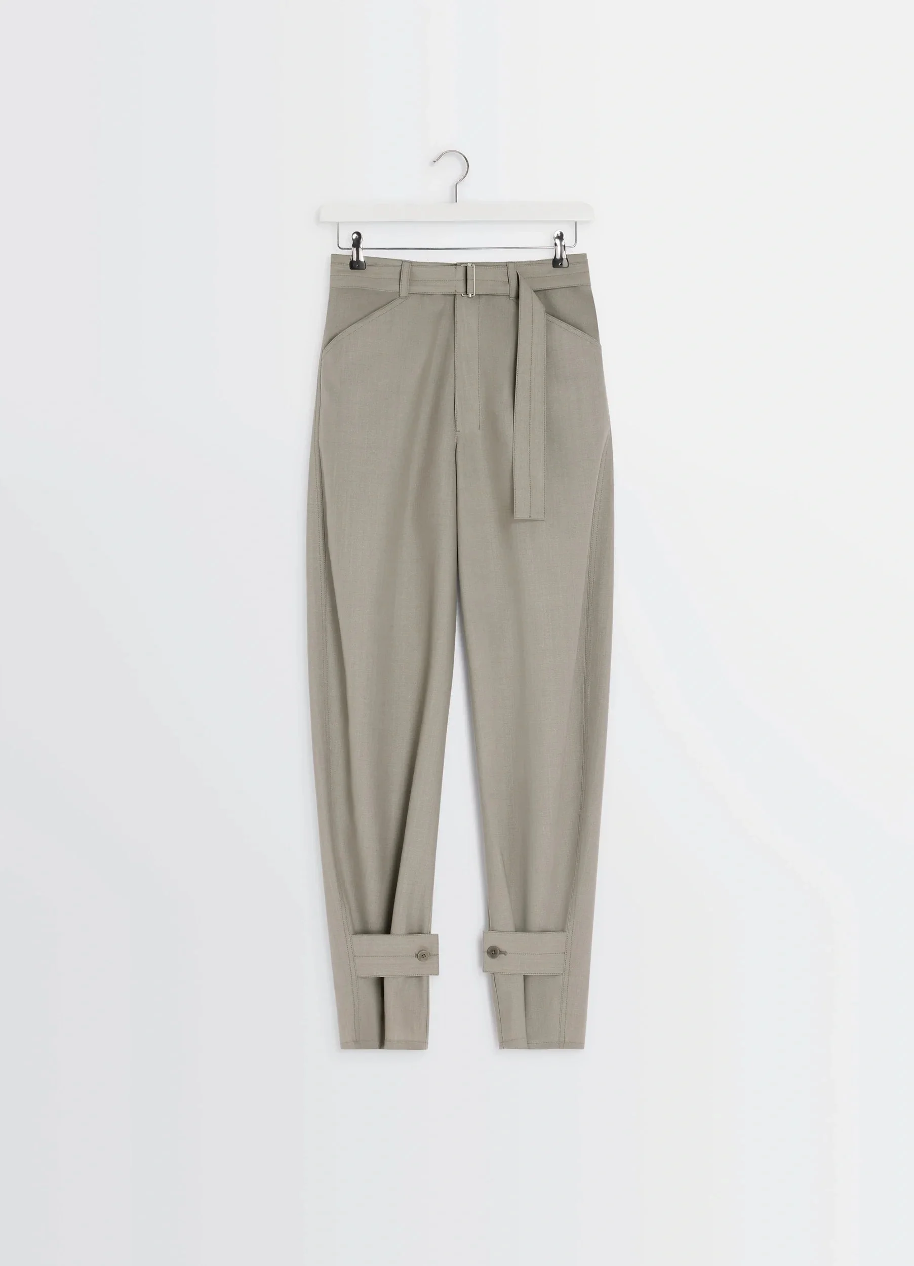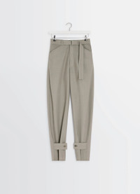 These curved tailored pants are made from a tropical wool blend fabric. Oversized in cut, they reinterpret the world of traditional suiting and represent Lemaire's approach to singular elegance. The model is 177 cm tall and is wearing a size 36 (S). These curved tailored pants are made from a tropical wool blend fabric. Oversized in cut, they reinterpret the world of traditional suiting and represent Lemaire's approach to singular elegance. The model is 177 cm tall and is wearing a size 36 (S). DETAILS Curved tailored pants in tropical wool blend Straight cut Belt loops at the waistband Matching removable belt with metal bucket Closure with hooks, buttons, and hidden zipper Italian side pockets Welted pockets, including one buttoned at the back Adjustable model with button tabs at the ankles < Made in Portugal Style : PA1223 LF414 Curved tailored pants in tropical wool blend Straight cut Belt loops at the waistband Matching removable belt with metal bucket Closure with hooks, buttons, and hidden zipper Italian side pockets Welted pockets, including one buttoned at the back Adjustable model with button tabs at the ankles < Made in Portugal Style : PA1223 LF414 CARE Main Material: 55% Polyester 45% Wool Main Lining: 100% Cotton Do not wash Do not bleach Do not tumble dry Cool ironing Soft dry clean Main Material: 55% Polyester 45% Wool Main Lining: 100% Cotton Do not wash Do not bleach Do not tumble dry Cool ironing Soft dry clean