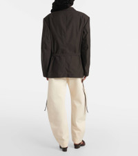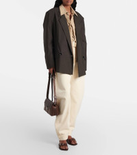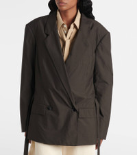 Inspired by traditional menswear codes, this blazer from Lemaire is made from smooth cotton and silk and cut to a generous double-breasted silhouette. It features a slender self-tie detail to accent the waistline. Product Details - Material: 80% cotton, 20% silk - Care instructions: hand wash - Made in Slovakia - Designer color name: Dark Espresso - Item color: brown - Pockets: breast pocket, slit pockets - Closure: double-breasted - Detachable belt - Item number: P01068608 Size & Fit - True to size - Shoulder pad inserts - Loose fit, comes with belt - Non-stretchy fabric - Falls below the hip - The model seen in the picture is 178cm-5'10" and wearing a size FR 36