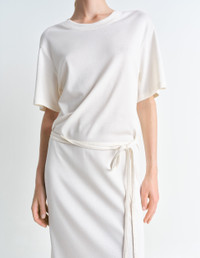 This Belted Rib T-shirt Dress is a staple of LEMAIRE’s feminine wardrobe. It is made of a mid-weight cotton jersey woven into a soft, flexible rib with a textured quality. The loose, ankle-length shape features an open round neck and rounded shoulders. Details include a ribbed collar, flat shoulder seams and a removable matching belt - long enough to be belted several times around the waist. DETAILS - Relaxed fit - Removable matching belt - Below-the-knee length - Elbow-length sleeves. - Ribbed collar and cuffs Made in Portugal Style: DR1045 LJ1016 The Model is 179cm / 5'10½" ft and is wearing a size 36 (S). CARE Main Fabric: 100% Cotton Soft wash 30° Do not bleach Do not tumble dry Cool ironing Do not dry clean Dry flat