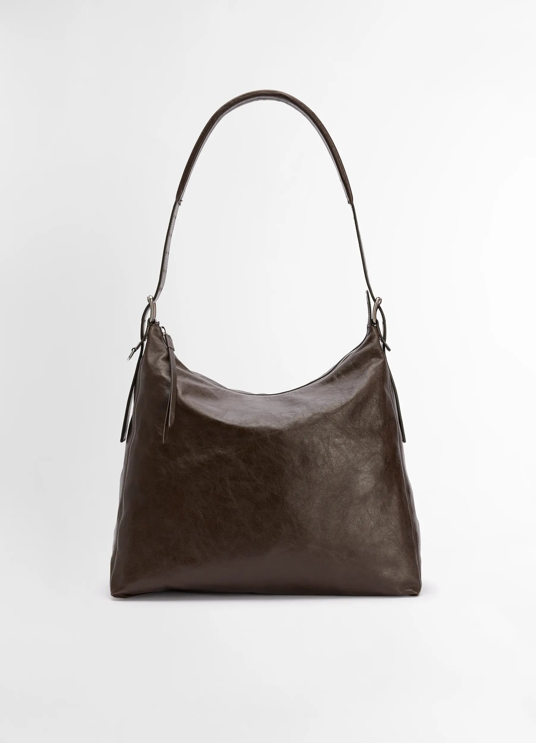 This iconic LEMAIRE style is reinvented this season in a thin and shiny leather with an elegant, shiny finish. The classic hobo silhouette features an adjustable strap with stitched padding, for added comfort and versatility. Its unlined sides keep its structure light and very supple, with a reinforcement lining securing the bottom. Double-pin buckles and D-Rings add to its utilitarian charm. DETAILS This bag can be worn on the shoulder or crossbody Adjustable strap Engraved metal buckles Zip closure Leather puller Length: 27cm / 6-in - Width: 34 cm / -in - Depth: 16 cm / 13,4-in Made in Spain Style: BG0144 LL0108 FABRICS & CARE Main Material: 100% Calf Do not wash Do not bleach Do not tumble dry Do not iron Professional leather clean only
