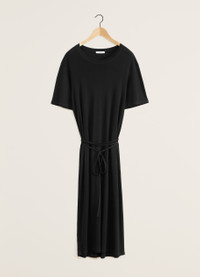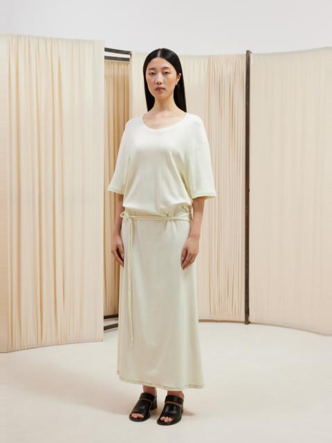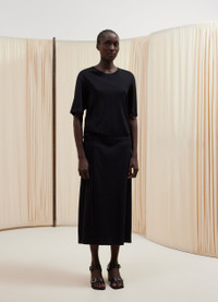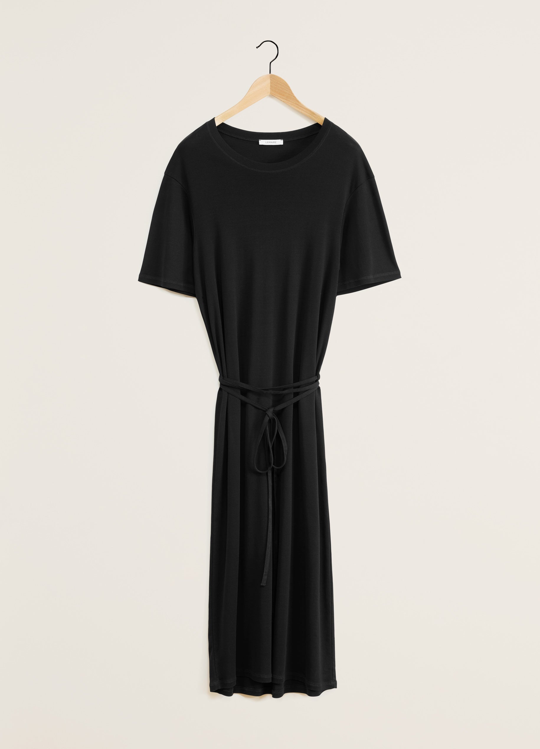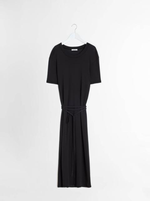 This garment is a new interpretation of the T-shirt Dress, a staple of LEMAIRE’s wardrobe. It is made of a mid-weight cotton jersey woven into a soft, flexible rib with a textured quality. The loose, ankle-length shape features an open round neck and rounded shoulders. Details include a ribbed collar, flat shoulder seams and a removable matching belt - long enough to be belted several times around the waist. DETAILS - Relaxed fit - Removable matching belt - Below-the-knee length - Elbow-length sleeves. - Ribbed collar and cuffs Made in Portugal Style: DR1045 LJ1016 FABRICS & CARE Main Material: 100% Coton Soft wash 30° Do not bleach Do not tumble dry Cool ironing Do not dry clean Dry flat