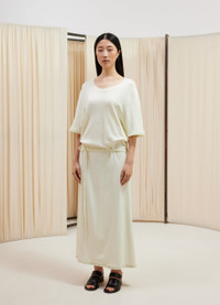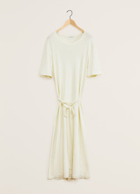 This garment is a new interpretation of the T-shirt Dress, a staple of LEMAIRE’s wardrobe. It is made of a mid-weight cotton jersey woven into a soft, flexible rib with a textured quality. The loose, ankle-length shape features an open round neck and rounded shoulders. Details include a ribbed collar, flat shoulder seams and a removable matching belt - long enough to be belted several times around the waist. DETAILS - Relaxed fit - Removable matching belt - Below-the-knee length - Elbow-length sleeves. - Ribbed collar and cuffs Made in Portugal Style: DR1045 LJ1016 FABRICS & CARE Main Material: 100% Coton Soft wash 30° Do not bleach Do not tumble dry Cool ironing Do not dry clean Dry flat