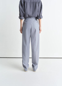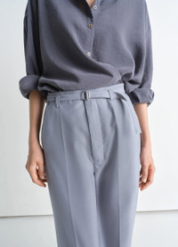This model is a must-have in the LEMAIRE wardrobe. The Tailored Belted Pants are made of lightweight tropical poly-wool, with a mottled weave and dense, supple hand. This straight-cut model features a tapered leg with a pleat to hold its shape, a slim removable waistband with a fine metal adjuster and belt loops, and a zipper fly. Tone-on-tone topstitching runs along the seams throughout the garment. It also features a welt pocket on the back, closed with a corozo button. DETAILS - Regular fit - Tapered leg - Removable belt - Welt back pocket - Zip fly Made in Romania Style: PA1198 LF414 FABRICS & CARE Main Fabric: 55% Polyester, 45% Wool Main Lining:100% Cotton Do not wash Do not bleach Do not tumble dry Cool ironing Soft dry clean