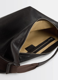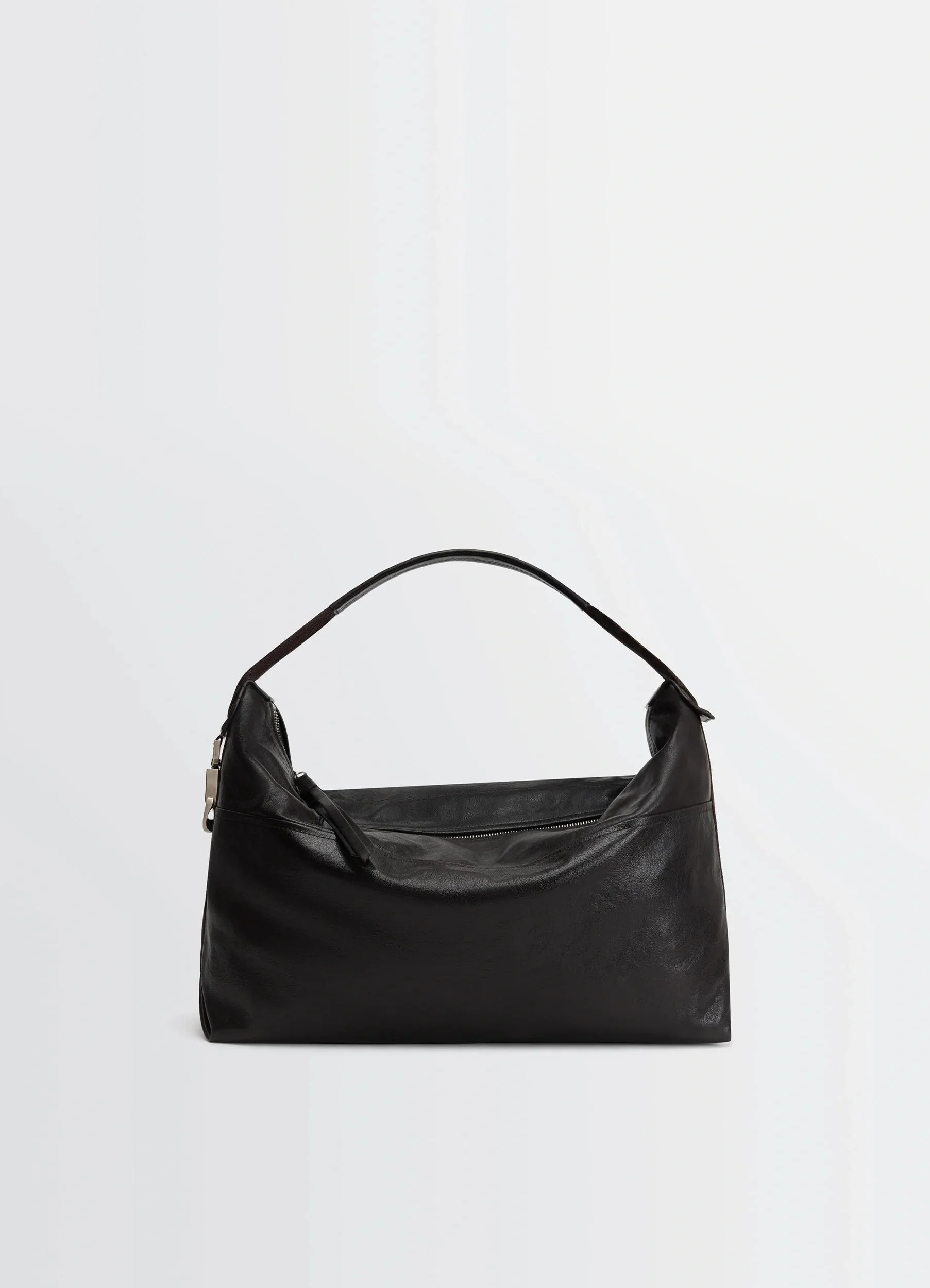 The Berlingot line reinterprets archetypal shapes in a minimalist, utilitarian spirit. It plays on contrasts thanks to a nylon strap and a metal side snap hook. Designed to carry everyday essentials, this Hobo bag is flexible, versatile and casual. It's made from LWG Gold-certified glazed paper leather, a lightweight, resistant material with a glossy finish. The Berlingot line reinterprets archetypal shapes in a minimalist, utilitarian spirit. It plays on contrasts thanks to a nylon strap and a metal side snap hook. Designed to carry everyday essentials, this Hobo bag is flexible, versatile and casual. It's made from LWG Gold-certified glazed paper leather, a lightweight, resistant material with a glossy finish. DETAILS Berlingot Hobo bag in paper lux leather Soft elongated model Hand and shoulder carry Nylon handle and leather shoulder support Leather-covered side loops Metal side carabiner hook Zipper closure with double slider and long leather pull tabs Cotton canvas lining Zipped inside pocket Lemaire logo embossed inside Silver-plated metalwork Dimensions: Length: 43 cm Height: 28 cm Depth: 18 cm Arrow height: 30 cm Handle length:52 cm Made in Spain Style : BG0190 LL0108 Berlingot Hobo bag in paper lux leather Soft elongated model Hand and shoulder carry Nylon handle and leather shoulder support Leather-covered side loops Metal side carabiner hook Zipper closure with double slider and long leather pull tabs Cotton canvas lining Zipped inside pocket Lemaire logo embossed inside Silver-plated metalwork Dimensions: Length: 43 cm Height: 28 cm Depth: 18 cm Arrow height: 30 cm Handle length:52 cm Made in Spain Style : BG0190 LL0108 CARE Main material: 100% calf Main lining: 100% cotton Trims: 100% polyamide/nylon Do not wash Do not bleach Do not tumble dry Do not iron Professional leather clean only Main material: 100% calf Main lining: 100% cotton Trims: 100% polyamide/nylon Do not wash Do not bleach Do not tumble dry Do not iron Professional leather clean only